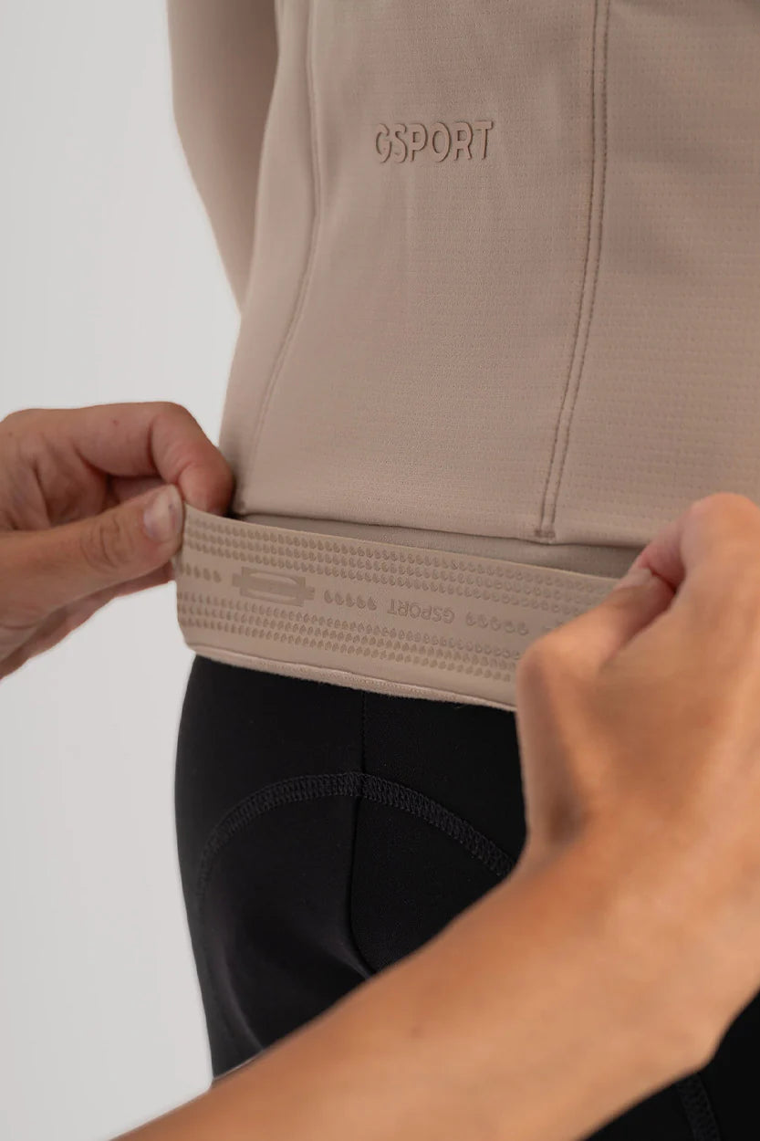 - Terminación Bonding 4 cm (costura sin hilo) y goma trasera personalizada Gsport a tono, para fijar el maillot en su posición durante el pedaleo.